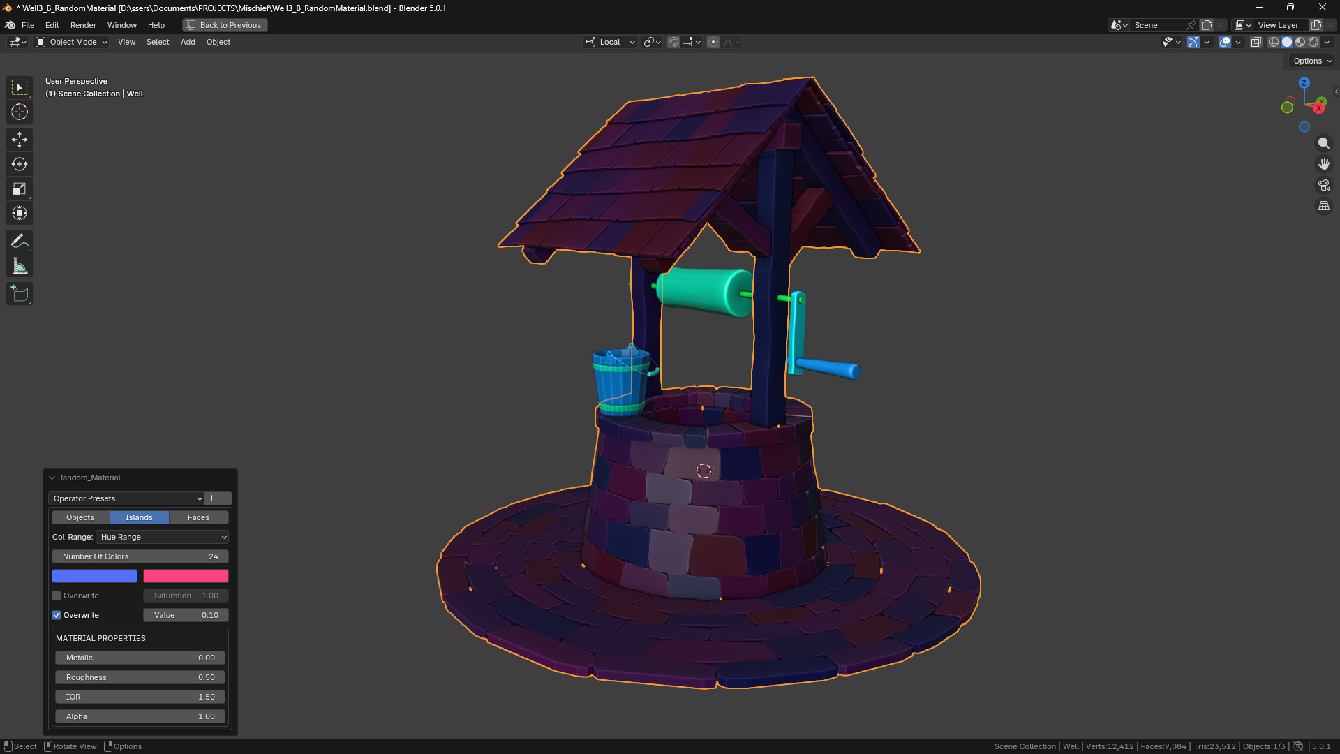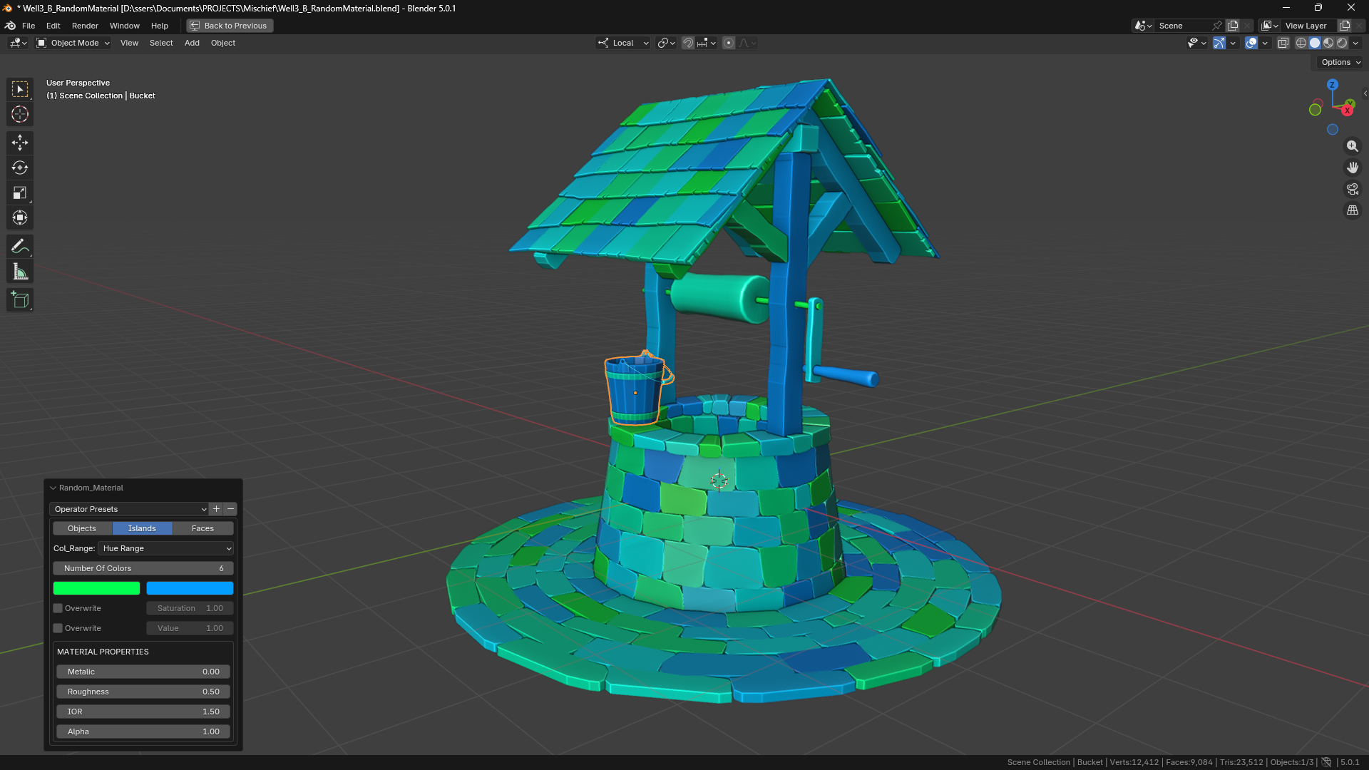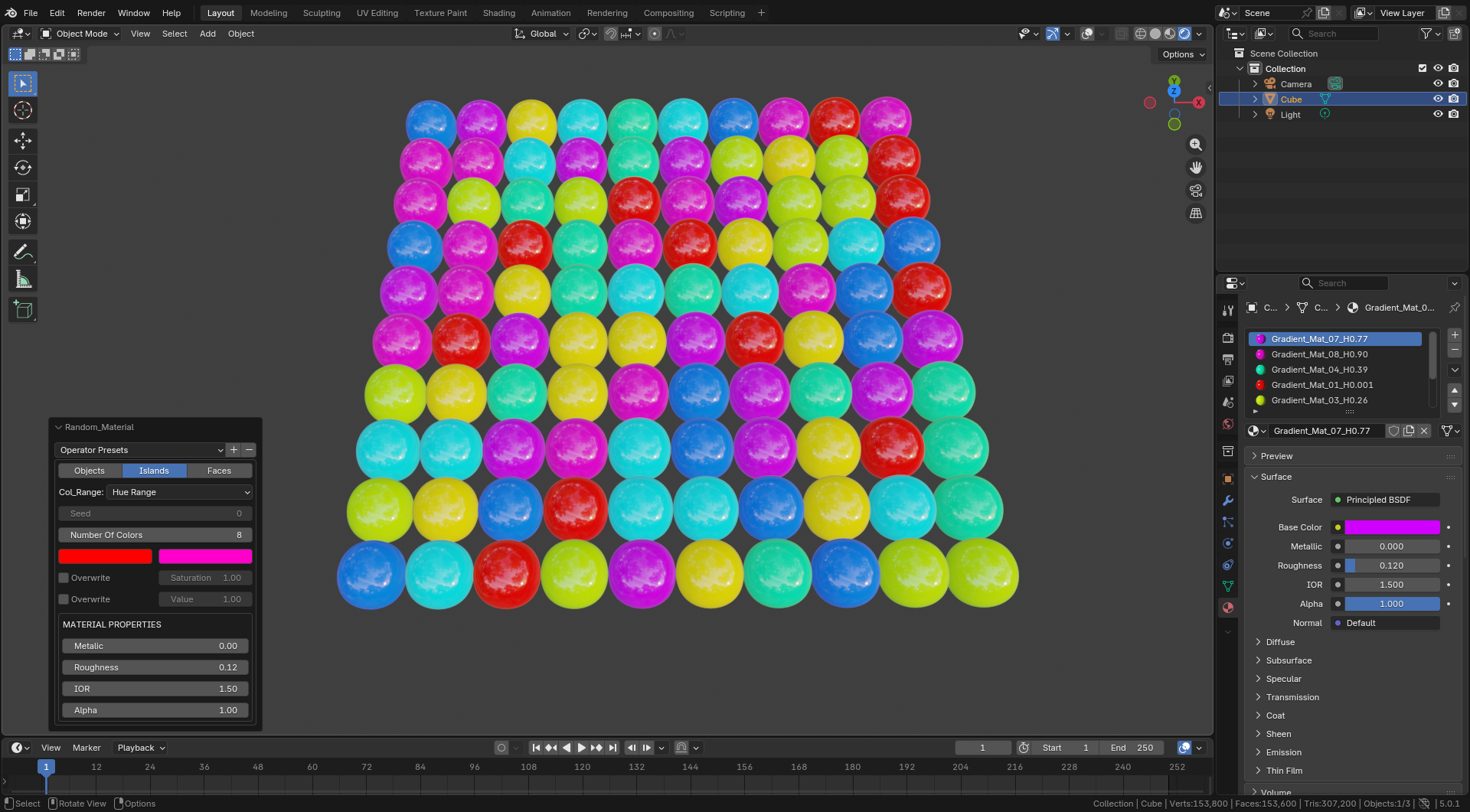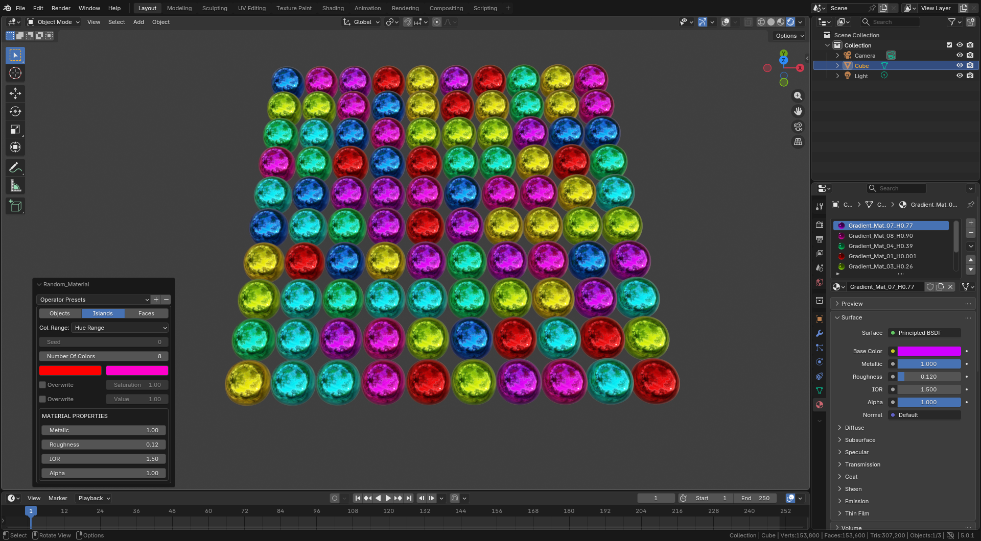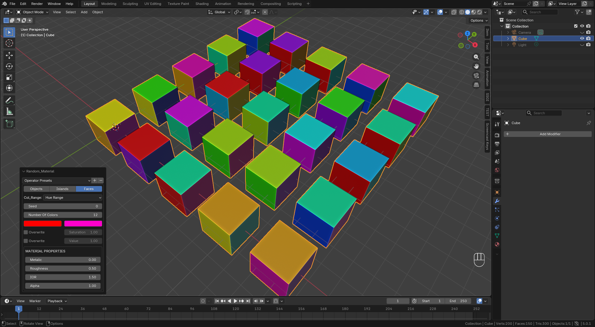 Assign random materials to all selected objects or their islands or faces with a single click, either using a hue range or user set custom materials.