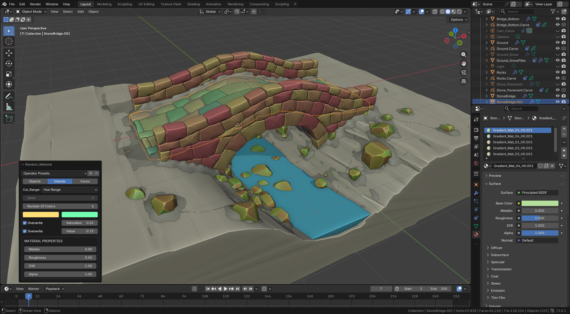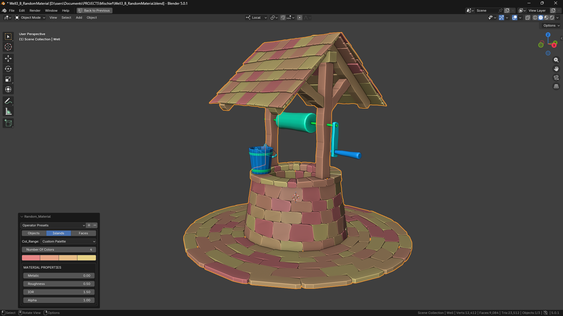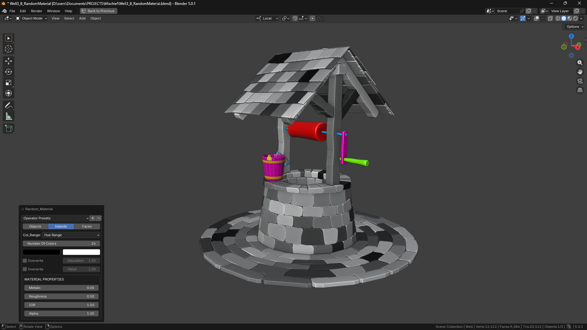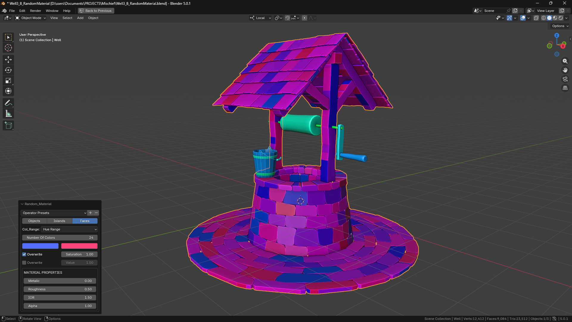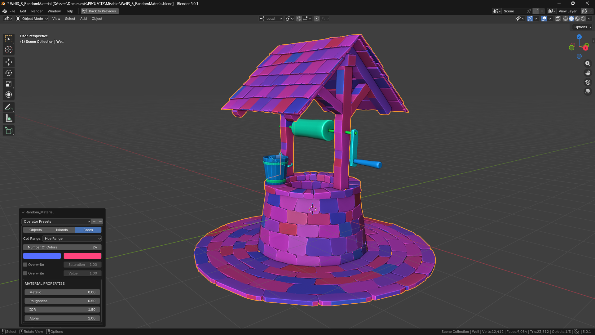 Assign random materials to all selected objects or their islands or faces with a single click, either using a hue range or user set custom materials.