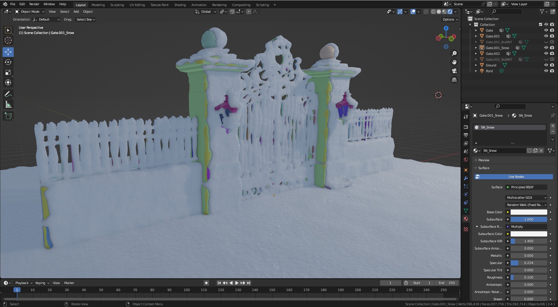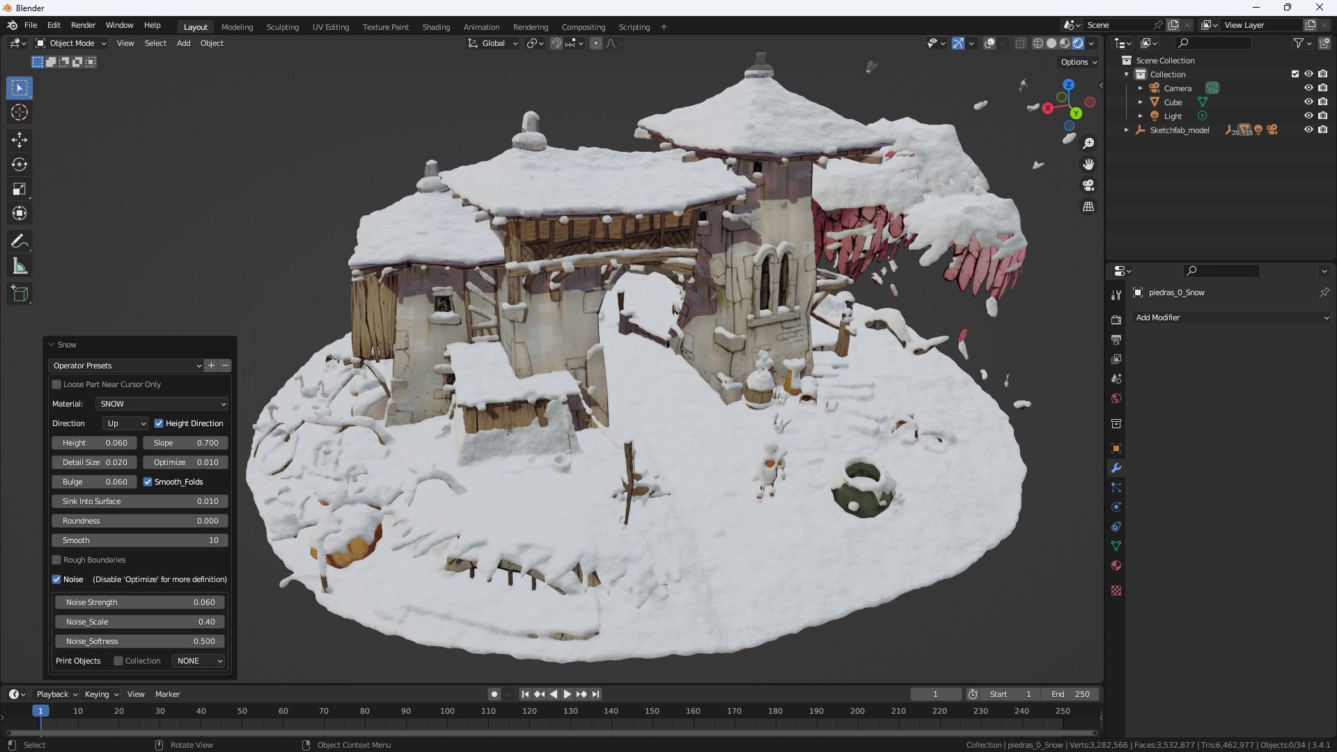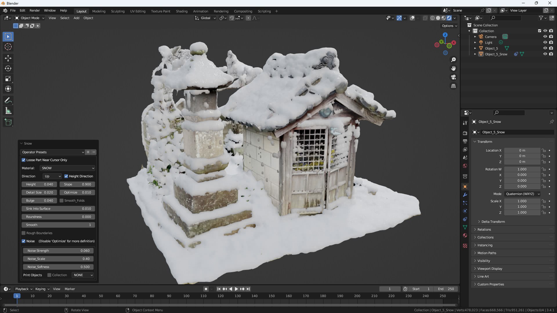 Create snow on selected objects in your scene with a single click. Adjust snow height, direction, shape and detail as needed. Create footprints using any object or collection in the scene.
