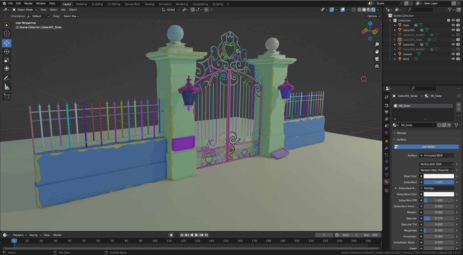Tip: Snow is geometry-based (not texture-based). For large areas like grass fields, apply snow to the ground mesh instead of individual grass objects.